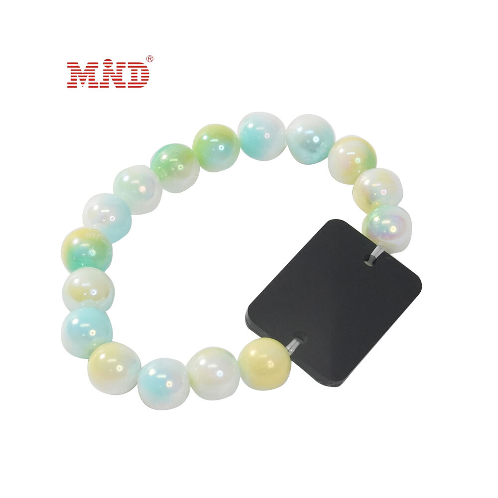 تُصنع أساور RFID المزينة بالخرز من أنواع مختلفة من علامات RFID مع مواد خشبية، وبولي كلوريد الفينيل (PVC)، والأكريليك، والسيليكون. ويمكن دمج شرائح RFID وNFC داخلها.